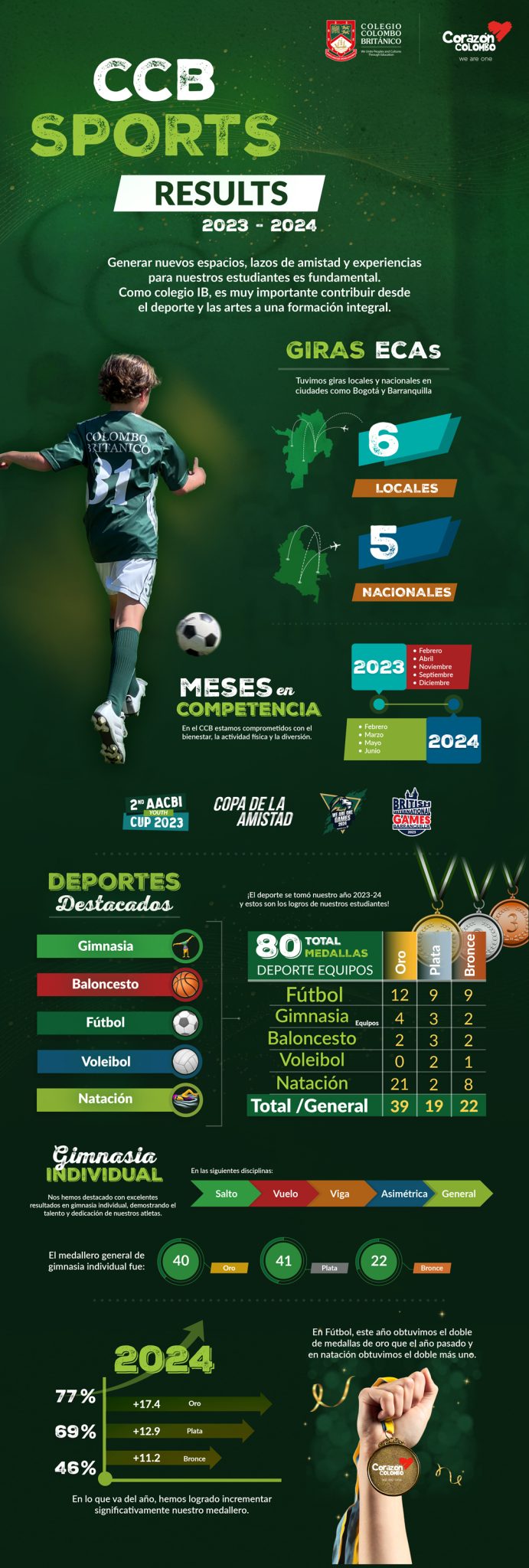 Durante el año lectivo 2023-24, los diferentes equipos del CCB se destacaron por sus logros deportivos en diferentes disciplinas y dejaron en alto el nombre del colegio, en cada una de las competencias que se disputaron. Estos resultados van de la mano con el incremento en participación que ha habido de estudiantes en las actividades extracurriculares que ofrecemos. Un año, a todas luces, lleno de aprendizajes y victorias.